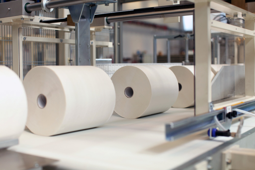 Il layout è improntato alla massima efficienza, in modo da garantire un’alimentazione costante, così da evitare tempi morti e, al contempo, non sovraccaricare le macchine. Subito dopo la fase di processo intervengono, a seconda del caso, un gruppo per il raddrizzamento dei rotoli industriali o un sistema di impilamento dei rotoli di carta igienica, operazioni propedeutiche alla successiva fase di confezionamento, che nel caso dei prodotti per impiego industriale e medico avviene tramite l’impiego di AL80, mentre i rotoli di carta igienica passano direttamente alla successiva fase di insaccamento.