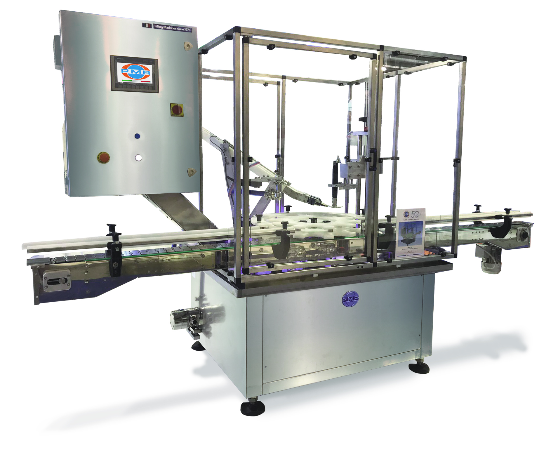 Il monoblocco può essere dotato di diversi tappatori: pneumatico, meccanico con frizione magnetica, brushless. Il posizionamento del tappo è automatico, con caricatore/orientatore mono-formato, “a strappo” o con pick&place, in funzione delle caratteristiche del tappo stesso. Il quadro comandi è dotato di touch screen per eseguire regolazione e cambi di formato.