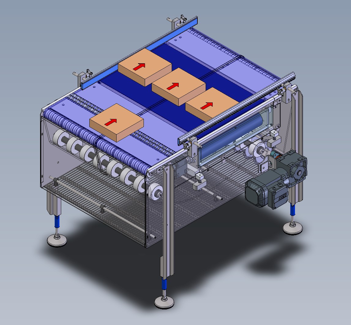 L’applicazione più classica prevede di sottoporre un nastro trasportatore a tappeto disposto ortogonalmente rispetto al moto della catena modulare. Azionare il moto del nastro sottoposto darà ai prodotti una componente trasversale di movimento che potrà essere usata per fare espulsione, selezione o smistamento su più file dei prodotti stessi. Come vedremo più avanti questa è l’applicazione per noi di maggiore interesse.