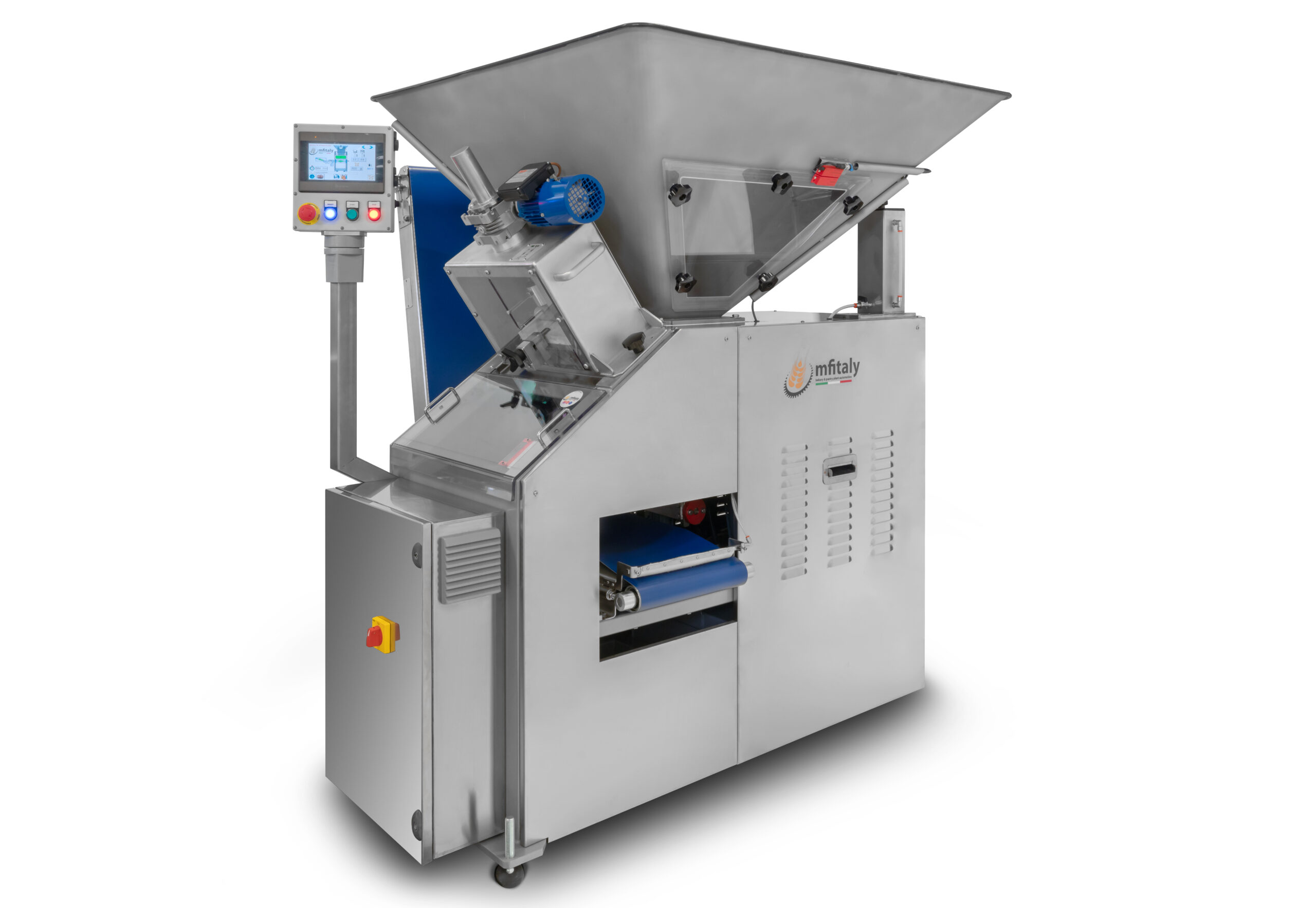 Proposta da MF Italy con funzionamento idraulico a circuito chiuso e scambiatore di calore, consente di regolare la pressata secondo il tipo di impasto utilizzato garantendo una produzione media o elevata senza stressare il prodotto. La spezzatrice è oil-free e non necessita di lubrificazione per il funzionamento.