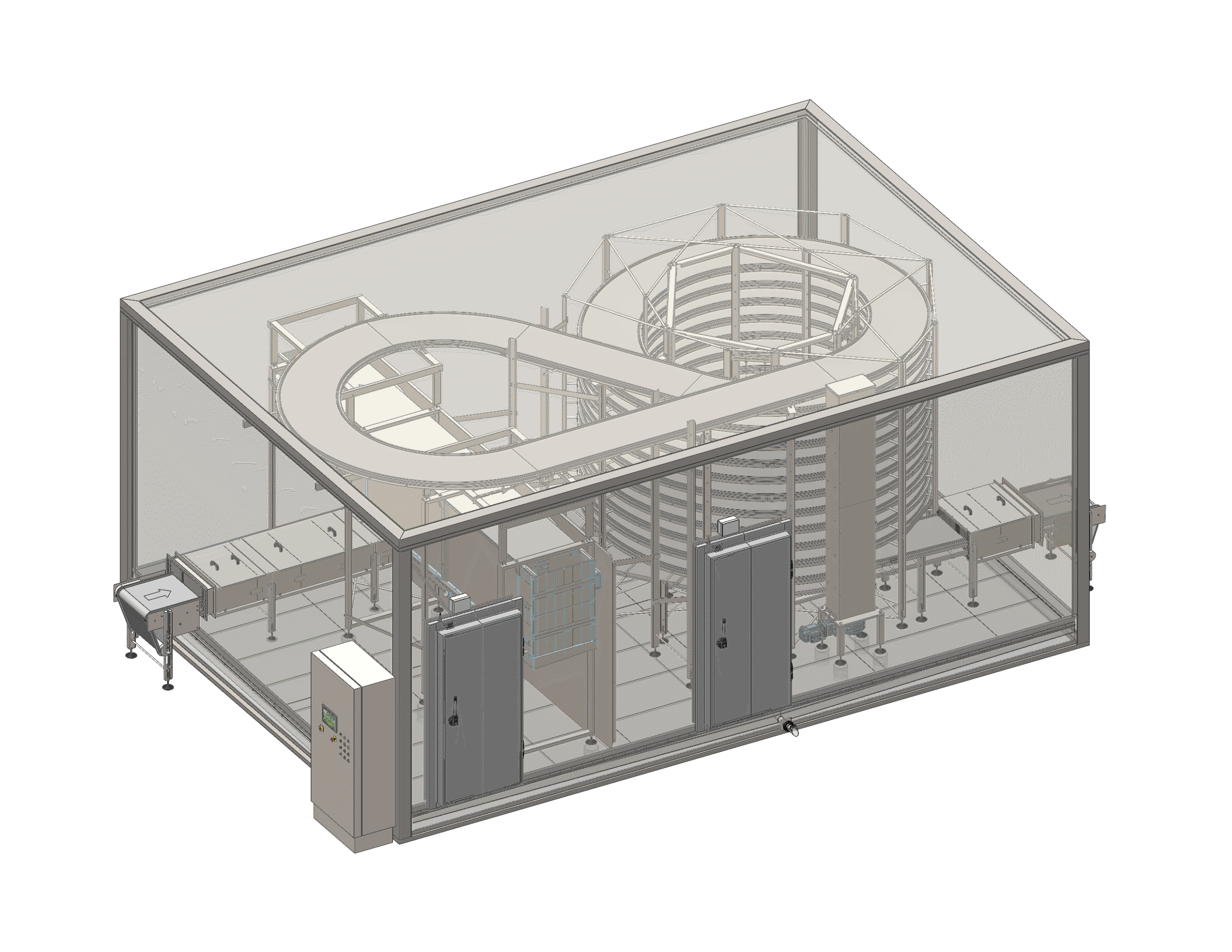Solitamente gli impianti sono pensati per accogliere il prodotto dopo la prima fase di produzione o trattamento (all’uscita del forno per il raffreddamento dopo la cottura o per la surgelazione dopo la formatura), e possono essere ottimizzati con il posizionamento di più macchine a monte, a valle o nella medesima posizione per completare il processo termico desiderato. Inoltre è possibile combinare due processi diversi nella stessa macchina.