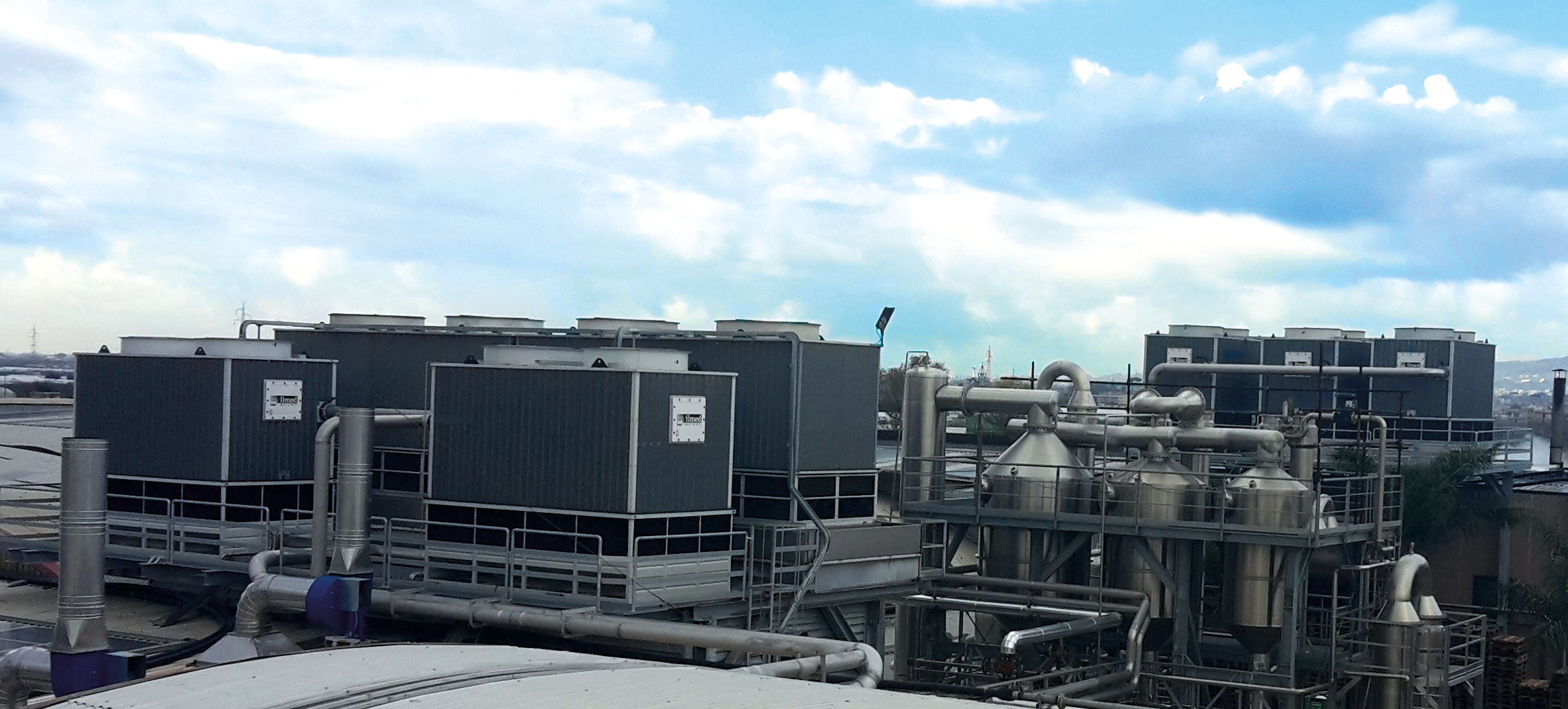 Nei suoi 40anni di attività ha maturato esperienze nella produzione di torri di raffreddamento dell’acqua, sia in versione package preassemblate sia montate in sito. I suoi impianti sono proposti chiavi in mano per soddisfare ogni esigenza, completi di ricambi e revamping per ogni tipologia e marca di torre evaporativa. La foto mostra un’installazione tipica destinata al settore conserviero.
