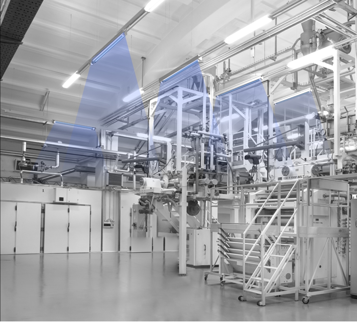 - disinfezione profonda delle superfici dei locali di produzione e confezionamento, dove la luce UV-C può arrivare a decontaminare punti anche difficilmente raggiungibili con le normali operazioni di pulizia;