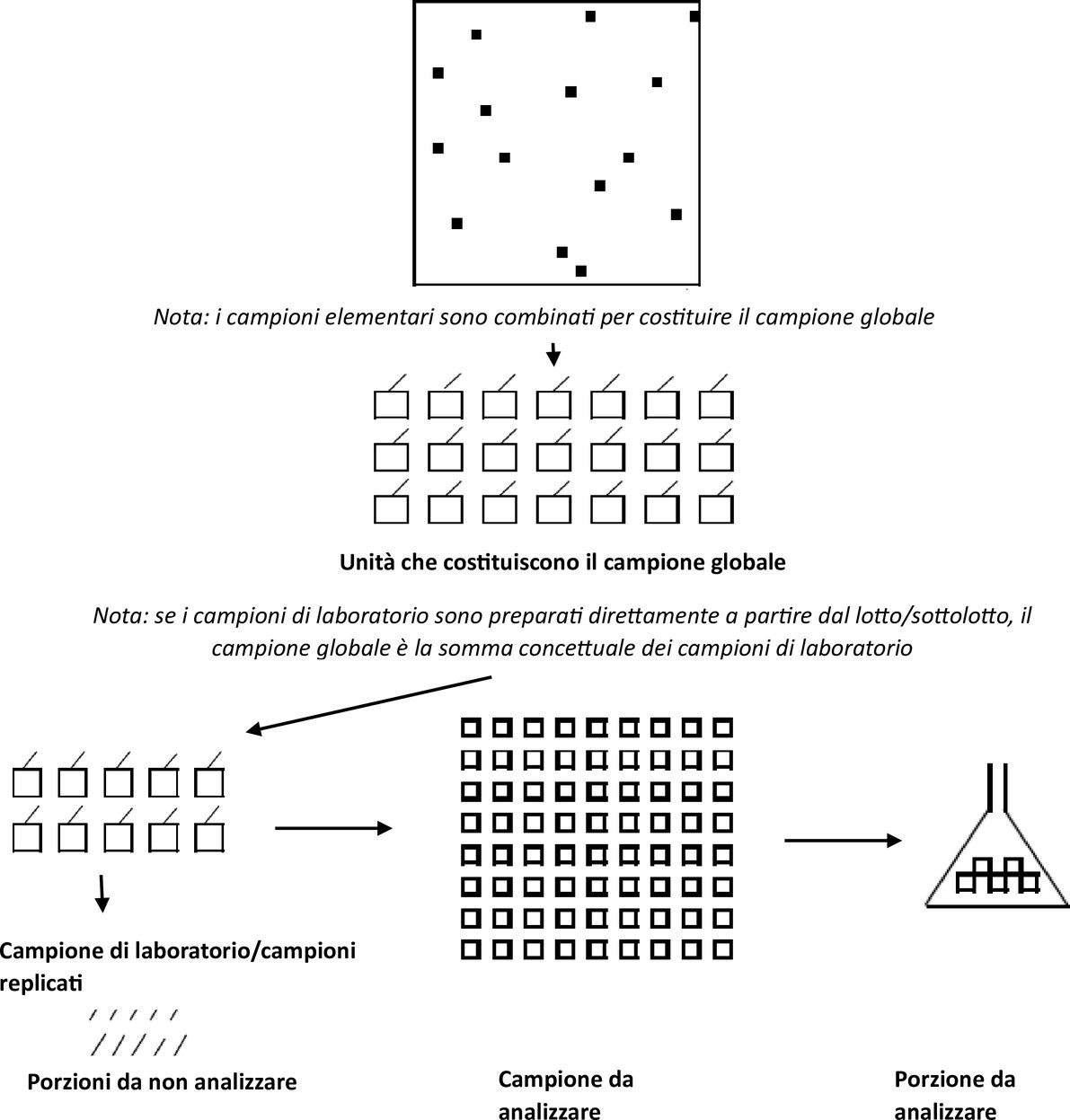 Il funzionario responsabile del campionamento preleva campioni elementari da diversi punti scelti in modo casuale e distribuiti uniformemente in tutta la partita campionata; i campioni devono essere di dimensioni approssimativamente uguali. In casi eccezionali, qualora ciò non sia fisicamente possibile, il funzionario responsabile del campionamento preleva campioni elementari da punti casuali nella parte accessibile del lotto/sottolotto. In tali casi il funzionario responsabile del campionamento indica la procedura seguita nel verbale di campionamento.