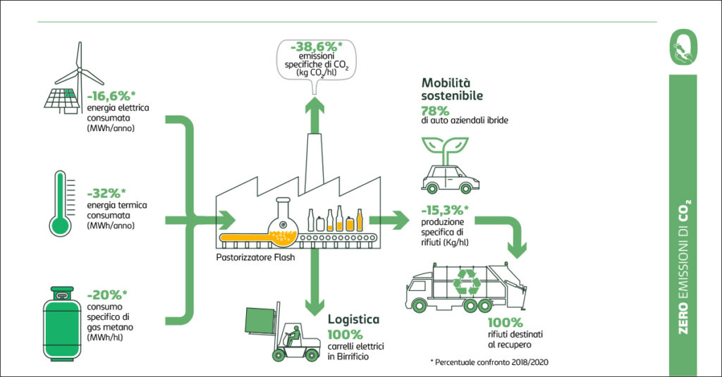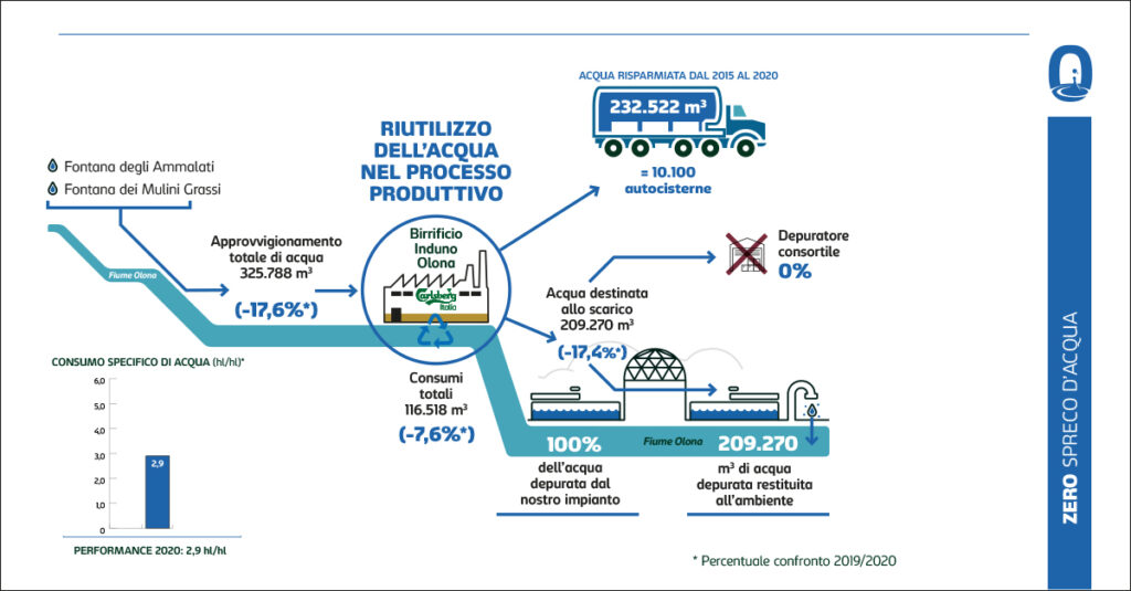 Per quanto riguarda il risparmio idrico, il principale investimento recente permette di dotare lo stabilimento di Induno Olona (VA) di un depuratore indipendente da quello consortile, che nell’ultimo anno ha permesso di depurare la totalità delle acque reflue, restituendo all’ambiente quasi 210mila metri cubi di acqua con qualità prossima a quella della fonte.  Il risparmio idrico, inoltre, passa anche attraverso il riutilizzo di parte dell’acqua destinata al lavaggio bottiglie per il raffreddamento dei macchinari. Anticipando il target 2022, il consumo specifico di acqua per ettolitro di birra prodotta è oggi pari a 2,9 hl/hl.