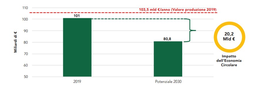 I governi e le aziende, in particolare quelle della filiera alimentare, giocano un ruolo chiave nello sviluppo di un approccio circolare, frutto della responsabilità ad essi affidata e delle risorse e capacità di cui dispongono. Da ciò ne deriva l’importanza della sfera economica per un approccio circolare: imprese e governi mirano infatti ad uno sviluppo che sia sostenibile ma al tempo stesso economicamente efficiente. Nel 2019 il settore Food&Beverage ha fatto registrare un valore annuo di produzione pari a circa 103,5 miliardi di euro, con un valore dei costi totali di produzione pari a circa 101 miliardi di euro. L’effetto dell’adozione diffusa dell’Economia Circolare al 2030 può essere stimato in una riduzione dei costi di produzione per una quota compresa tra il 18% ed il 22% (Figura 1).