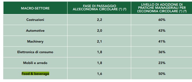 Per questa stessa ragione però è decisamente più complessa da adottare, perché richiede un ripensamento più profondo ed articolato del modello di business non solo della singola impresa ma dell’intero ecosistema di filiera. Dalle analisi di confronto svolte in sei macro-settori dell’economia italiana emerge che il settore e Food & Beverage registri una delle più alte percentuali di adozione (50%) di pratiche manageriali per l’economia circolare, tuttavia le aziende di questo settore si trovano ancora in una fase preliminare del processo di trasformazione delle pratiche da lineari a circolari (punteggio medio di 1,6 su una scala da 1 a 5). (Figura 3).