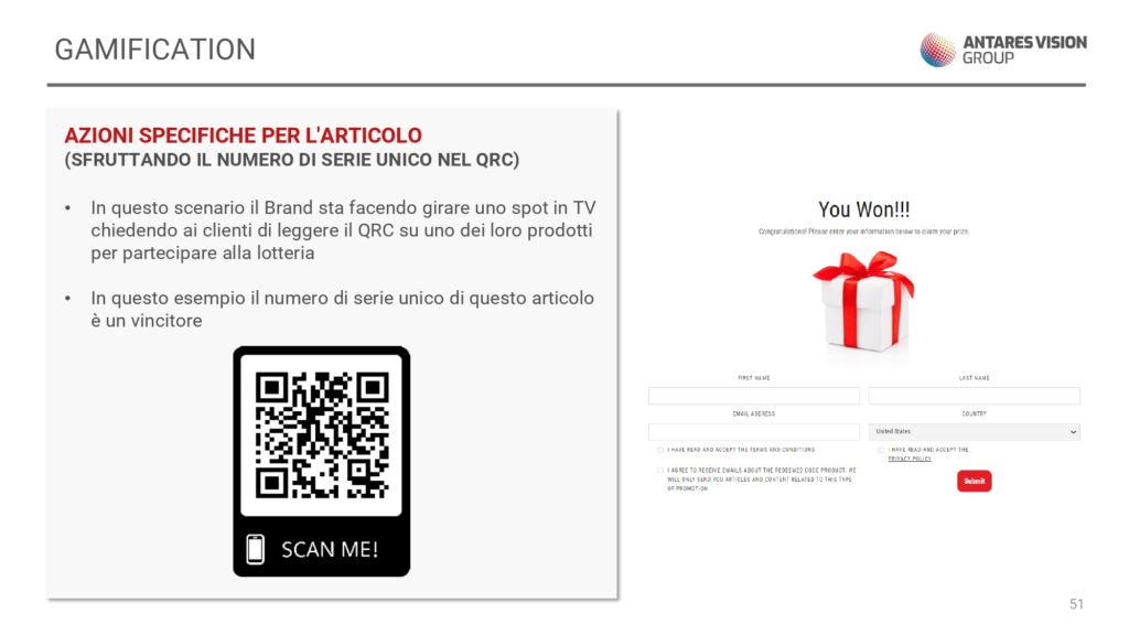 Alla trasparenza della supply chain resa possibile dal QR Code univoco, si affianca  un’esperienza di utilizzo da parte del consumatore finale interattiva e personalizzata (gamification, lotteria, intrattenimento, …)