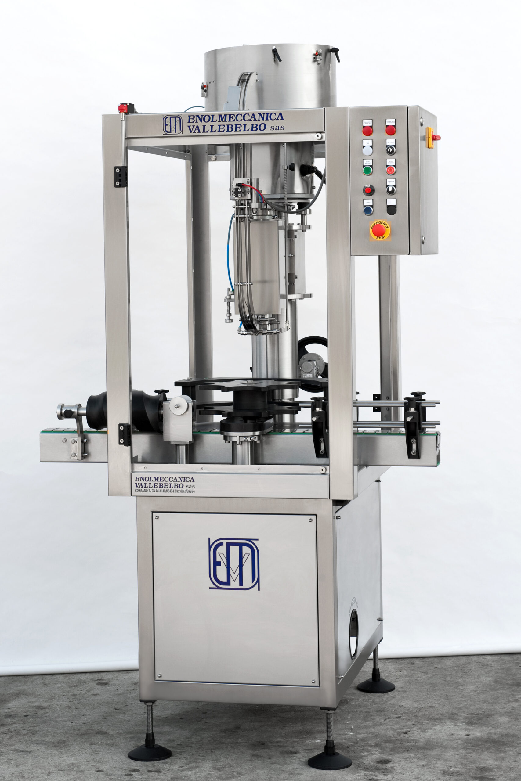 La capsulatrice automatica mod. MT/CX di Enolmeccanica Vallebelbo è adatta per applicazione su bottiglie in vetro del tappo corona mediante distribuzione al volo; è realizzata in acciaio INOX AISI 304; leghe di acciaio e materiali plastici per uso alimentare ne facilitano la pulizia, la sterilizzazione, la manutenzione e ne garantiscono una lunga durata. Il cambio delle attrezzature e la regolazione in altezza sono rapidi e semplici. Il sollevamento della testa è di tipo meccanico. La macchina è completa di alimentazione delle capsule, a vibrazione. Speciali dispositivi di sicurezza arrestano immediatamente la macchina per evitare rotture di bottiglie ed eventuali anomalie. Tutti i comandi elettrici sono realizzati secondo le norme vigenti.