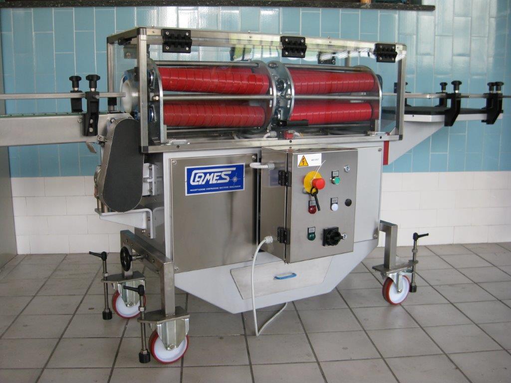 In risposta a un’aumentata richiesta dei produttori di spumante metodo classico, la Cames ripropone un macchinario semiautomatico già presente nella sua gamma di prodotti da oltre 30 anni, che consente di sostituire il remuage manuale. Il principio di funzionamento è molto semplice: la bottiglia viene movimentata da due serie di rulli inclinati, che la fanno girare in senso orario e in senso antiorario, provocando in tal modo la “rottura” dell’accumulo di sedimenti depositati sul tappo a corona durante l’invecchiamento. Il macchinario è concepito per una produzione fino a 500 b/h, in funzione della velocità di introduzione delle bottiglie da parte dell’operatore. Le dimensioni contenute e il montaggio su ruote ne facilitano l’impiego in cantina.