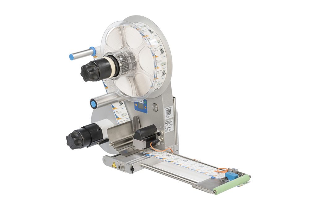 Costruita sulla base di un pressofuso in metallo verniciato è dotata di dispositivo di lettura etichette con fotocellula ad autoapprendimento regolabile o sensore a tasteggio particolarmente adatto alle etichette trasparenti.