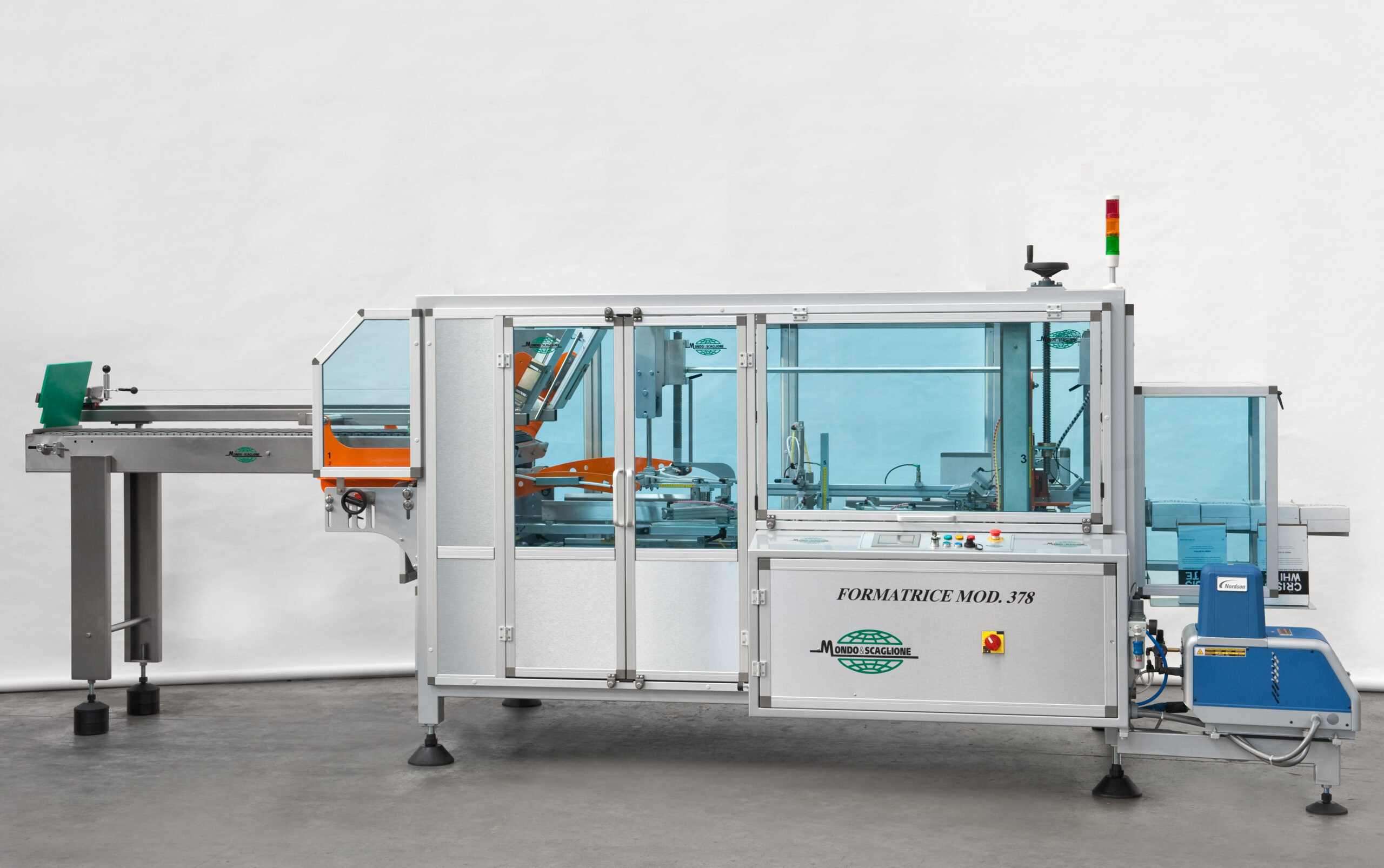Mondo & Scaglione presenta la formatrice di cartoni mod. 378/C, macchina che può raggiungere la velocità di 42 cartoni/minuto. Caratteristiche principali sono il “magazzino cartoni di lunga autonomia” che può essere esteso in base alle necessità di stoccaggio e approvvigionamento del cliente; il sistema di “accompagnamento controllato caduta” cartone dalla macchina al trasportatore di evacuazione in uscita al fine di permettere uno scarico controllato e dolce anche ad alte velocità; il basamento macchina completamente in acciaio inox AISI 304.