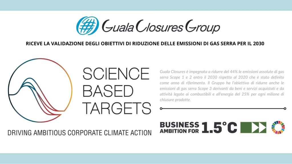 Guala Closures Group annuncia che i suoi obiettivi di riduzione delle emissioni di gas serra (GHG) per il 2030 sono stati validati da Science Based Targets (SBTi) in quanto soddisfano il più ambizioso obiettivo di limitare l’aumento della temperatura globale a 1.5°C come indicato dall’Accordo sul Clima di Parigi del 2015.
