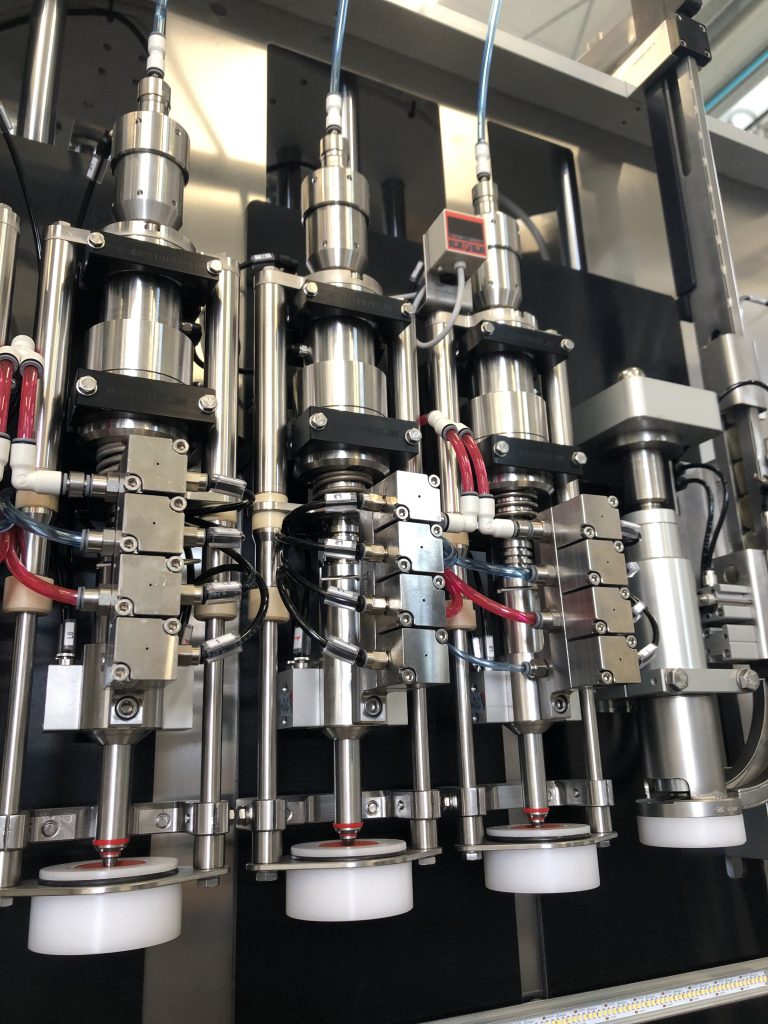 La valvola di riempimento (detta anche rubinetto) è composta da due stadi: uno controlla il flusso del prodotto, l’altro controlla il flusso del gas tra la bottiglia e la campana. I due stadi sono indipendenti tra di loro, così che si possano aprire o chiudere indipendentemente. Si ottengono in questo modo due risultati: spreco di prodotto pari a zero e precisione dei livelli.