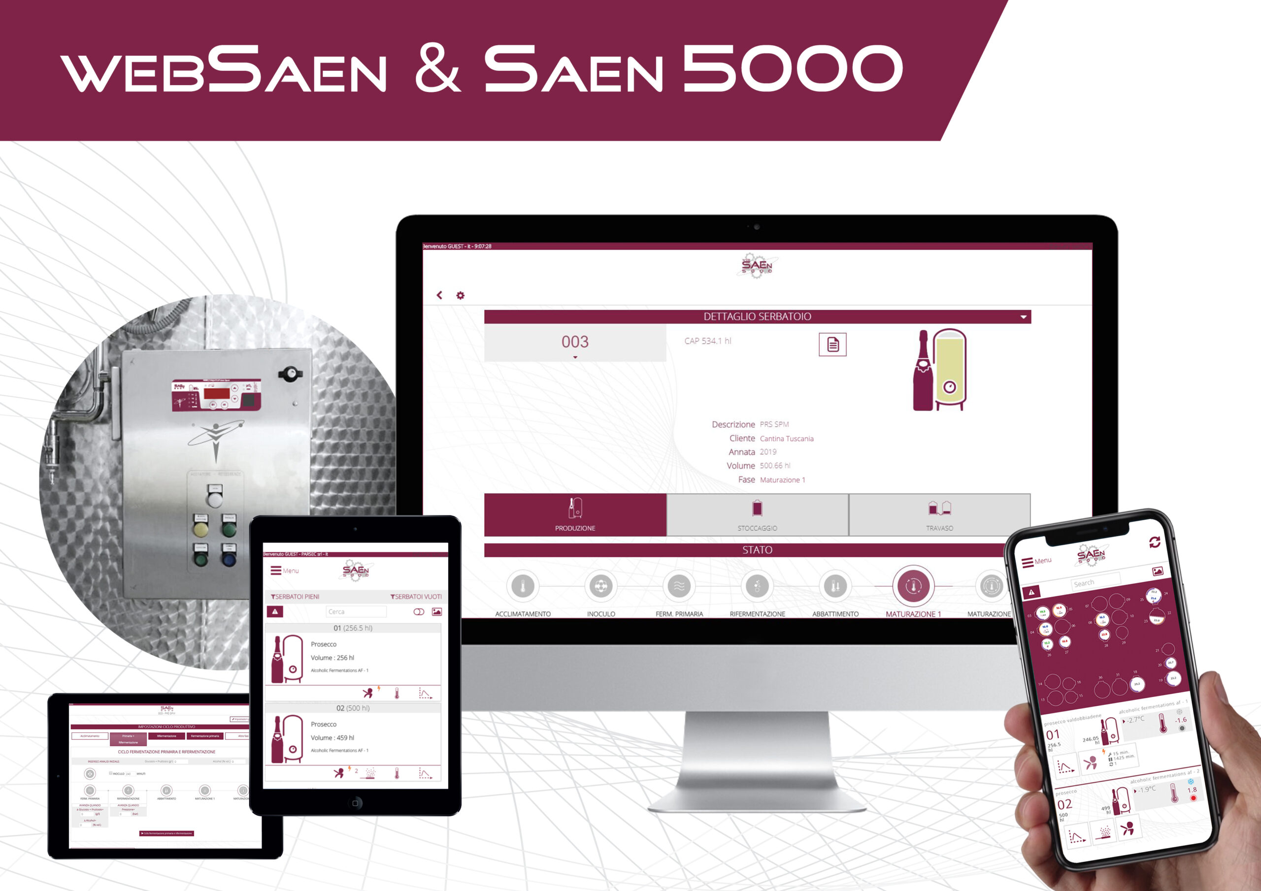 WebSAEn è un’applicazione 4.0 ben radicata nella tecnologia tecnologia avanzata, la capacità di calcolo e la precisione di SAEn5000, che integra al suo interno il controllo dei parametri e la gestione dell’automazione di tutte le funzioni della cantina moderna, dal controllo della temperatura dei serbatoi e degli ambienti, alla micro-ossigenazione, l’estrazione del colore e il controllo dinamico della fermentazione ADCF e della rifermentazione in autoclave di Aphromate.
