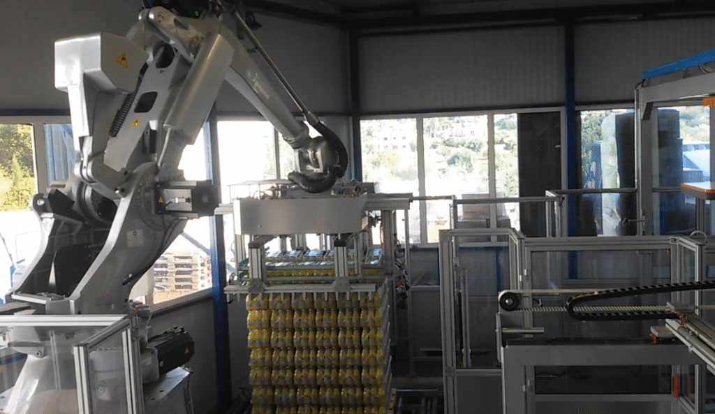 Sempre utilizzando un robot antropomorfo COMAU, interessante è il paletizzatore modello PAL 470 a strato intero per alte velocità, avente una testata di presa cartoni autoregolante che preleva e sposta lo strato intero di cartoni movimentandoli con una presa positiva dal fondo quindi non mantenendoli solamente sui lati per compressione, evitando eventuali scivolamenti verso il basso o danneggiamenti del prodotto all’interno delle scatole stesse. Il vantaggio di questo tipo di robot di paletizzazione, oltre alla velocità dei cicli di lavorazione, è la grande versatilità e flessibilità: infatti può ricevere prodotti differenti da più linee, posizionandoli su pallet di misure differenti.