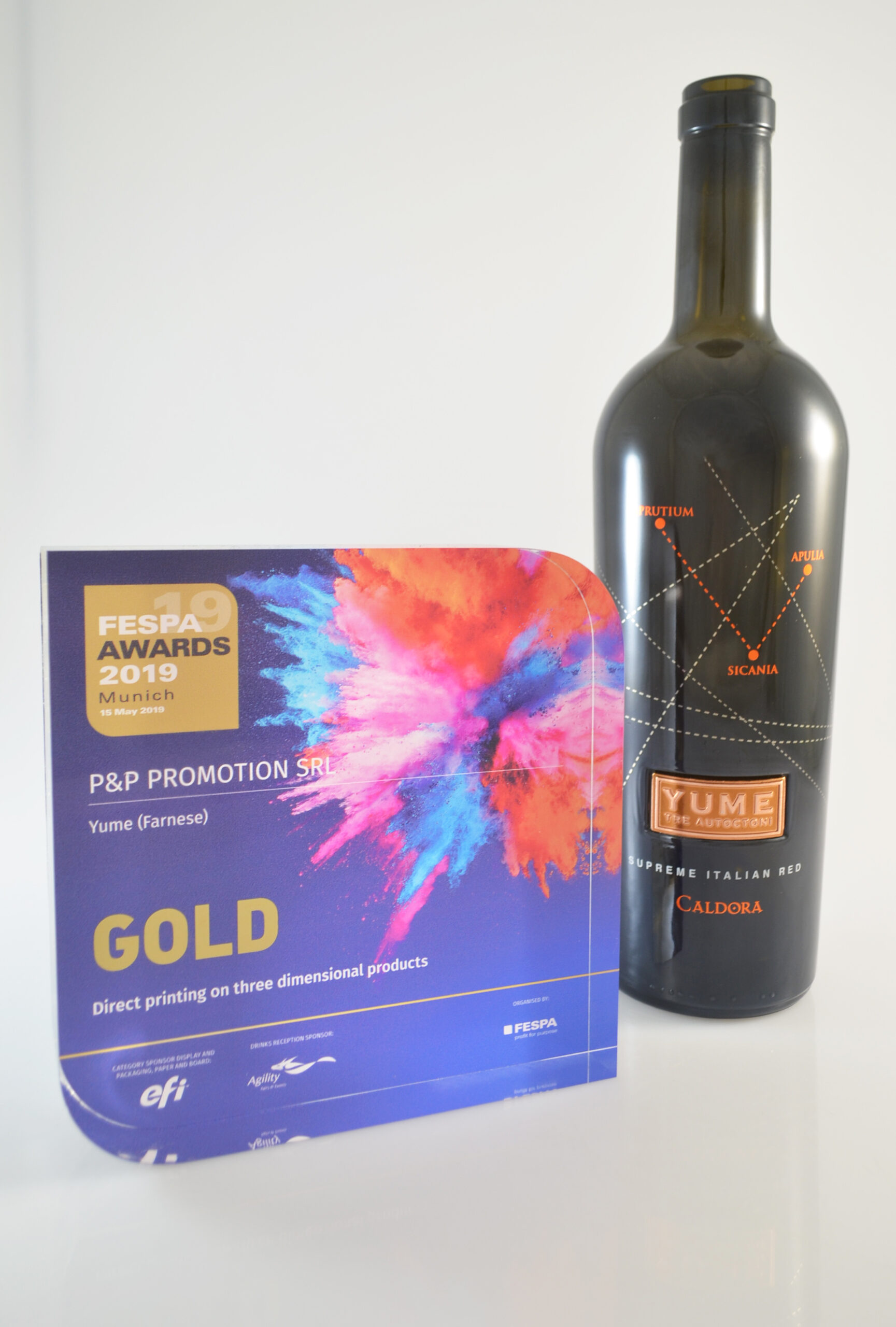 P&P Promotion trionfa con un oro nel concorso mondiale dedicato alla stampa d’eccellenza. Nella splendida cornice dei Fespa Global Award tenutisi a Monaco Di Baviera, l’azienda ha ottenuto il più prestigioso successo nella categoria “Direct Printing on Three Dimensional Object”, presentando un particolare progetto di stampa diretta e decorazione su bottiglia conica bordolese. Il packaging della bottiglia è stato realizzato attraverso la tecnica della serigrafia diretta a caldo, combinando tre diversi colori, bianco, platino puro e foil rame a caldo, più l’applicazione di una placca in ottone. Per P&P Promotion si tratta della terza vittoria del Fespa Gold Award, premi riconosciuti internazionalmente, che arricchiscono di orgoglio e soddisfazione Paolo Lorusso, CEO dell’azienda e il suo staff che ogni giorno lavora per realizzare i migliori progetti in termini di bellezza estetica, creatività e tecnologia.
