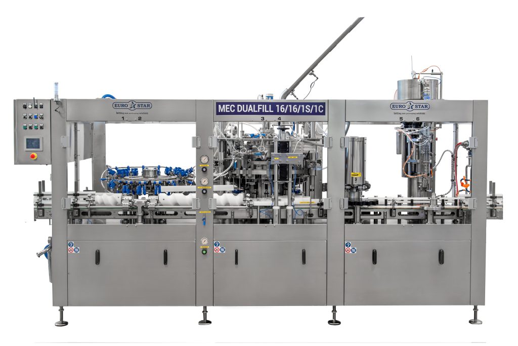 In quest’ottica EUROSTAR presenta la serie DUALFILL, pensata per rispondere alle esigenze di versatilità e all’ottimizzazione degli spazi. DUALFILL consente di riempire sia bottiglie che lattine con un unico impianto. Dotata di tecnologia isobarica meccanica, è progettata per il riempimento di bevande sia ferme che gassate, garantendo prestazioni elevate grazie al sistema rotativo automatico con opzione di doppia pre-evacuazione. Quest’ultima riduce l’ossidazione e migliora la qualità del prodotto finito.