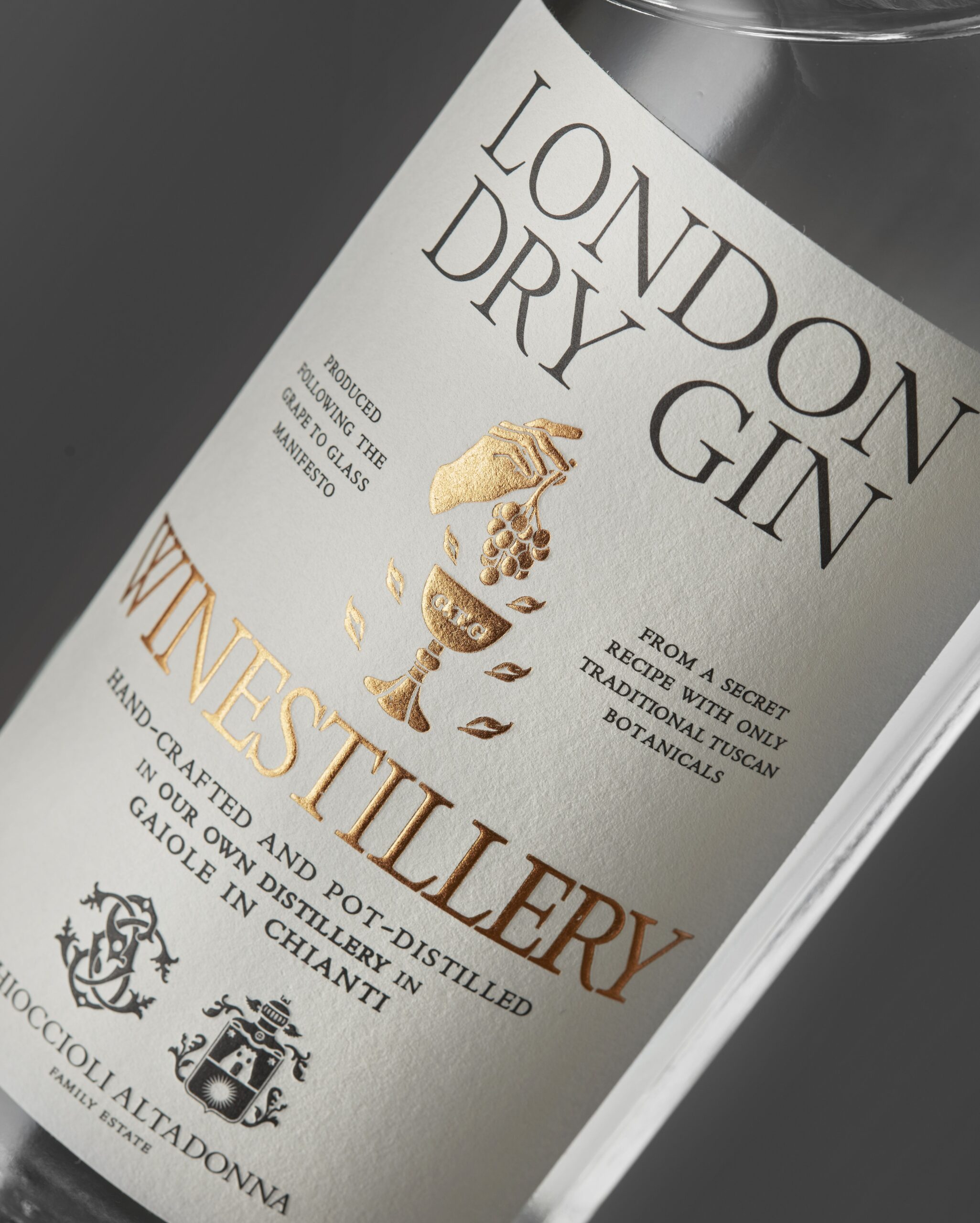 È un progetto che nasce dalla curiosità inventiva e dalla tenacia caparbia della famiglia Chioccioli Altadonna, produttori di vino nel cuore del Chianti Classico: obiettivo è quello di far nascere una distilleria nella loro azienda agricola. Stimolo ultimo che spinge Enrico, Stefano e Niccolò Chioccioli Altadonna non è quello però di ottenere un prodotto tradizionale; il grande alambicco di rame è lo strumento di base che serve a fornire una nuova e inedita interpretazione della loro produzione agricola: si punta a creare i più celebri distillati d’Europa, Vodka e Gin, utilizzando come materia prima le uve del Chianti Classico. In principio c’è un’intuizione legata al nome del prodotto, la crasi tra le parole Winery e Distillery riesce in un attimo ad evocare la natura dei prodotti, suona famigliare ma al contempo è inedita, stimola chi l’approccia a interrogarsi sul processo produttivo. Winestillery, la parola vera e propria, è stata la summa del briefing passato all’agenzia di comunicazione La Colonia di Milano, che ha affrontato il progetto di branding e definito il tono di voce e la grafica del marchio. Nell’affrontare il progetto i designer hanno colto come aspetto fondamentale quanto fosse potentemente radicale l’approccio alla creazione del prodotto che Enrico Chioccioli Altadonna, il Master Distiller, si è autoimposto. L’uso esclusivo di uve proveniente dalla propria azienda agricola, nessuna alterazione da aromi artificiali, imbottigliamento e invecchiamento come anche ogni distillazione devono avvenire in loco. Un corpo di limitazioni stringente può favorire l’ingegno, il rigore rende il gesto più preciso, il concept creativo del brand nasce attorno a un manifesto, definito Grape to Glass che veste ogni bottiglia e rivendica proprio la curiosità inventiva e la tenacia caparbia che si citava all’inizio. Grape to Glass diventa anche un disegno, un’icona che descrive le premesse produttive, il brand Winestyllery visualizza il suo DNA in due elementi, logo e manifesto. La forma e le proporzioni della bottiglia sono state scelte per inserirsi ottimamente in questi contesti. Un vetro in stile vecchia farmacia austero e robusto dal carattere retrò e un solido tappo in legno rendono la silhouette della bottiglia al contempo riconoscibile e allineata con le caratteristiche craft del prodotto. L’elemento centrale dell’etichetta è il logo in lamina rame a sbalzo che conferisce ricche caratteristiche tattili alla bottiglia, aiutate ulteriormente dalla carta “Rough Cotton” di UPM Raflatac grazie alla texture cotone morbida e pregevole. Il brand resta preminente su tutta la linea, mentre la differenza tra i prodotti salta all’occhio grazie al colore utilizzato per il fondo dell’etichetta, scelta versatile che abbraccia le esigenze creative sempre nuove del Master Distiller che propone con uguale audacia Gin di diverso stile, London Dry, e Old Tom, rigorosamente invecchiato in botti barrique. Ogni bottiglia è infine sigillata in un astuccio cilindrico che reca su di esso il manifesto, il vero fondamento sul quale il brand nasce e che vuole essere il primo approccio con il cliente.